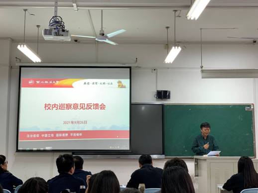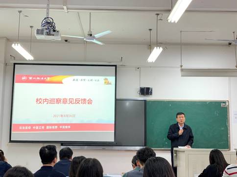 按照校党委2021年校内巡察工作统一部署,9月26日下午,小宝影院 在正心楼303教室召开校内巡察意见反馈会,校党委第二巡察组向学院反馈巡察情况。校党委副书记、党委第二巡察组组长郭武军,校纪委副书记、党委第二巡察组副组长康鹏及全体组员出席会议,学院领导班子成员、全体教职工及部分学生代表参加会议。会议由学院党委书记呼勇主持。