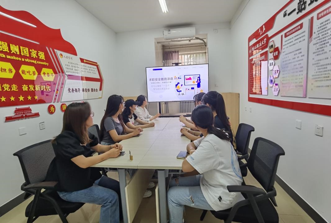 为提升学生就业意识,切实保障学生签约安全,2023年6月13日下午小宝影院 2019级辅导员徐泽蓉在四号学生公寓“一站式”学生社区综合管理服务站开展求职安全讲座,公寓楼学生代表参加。