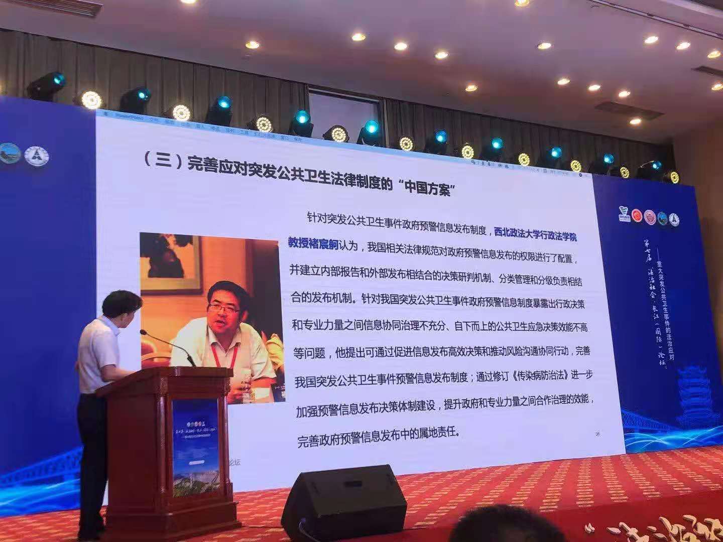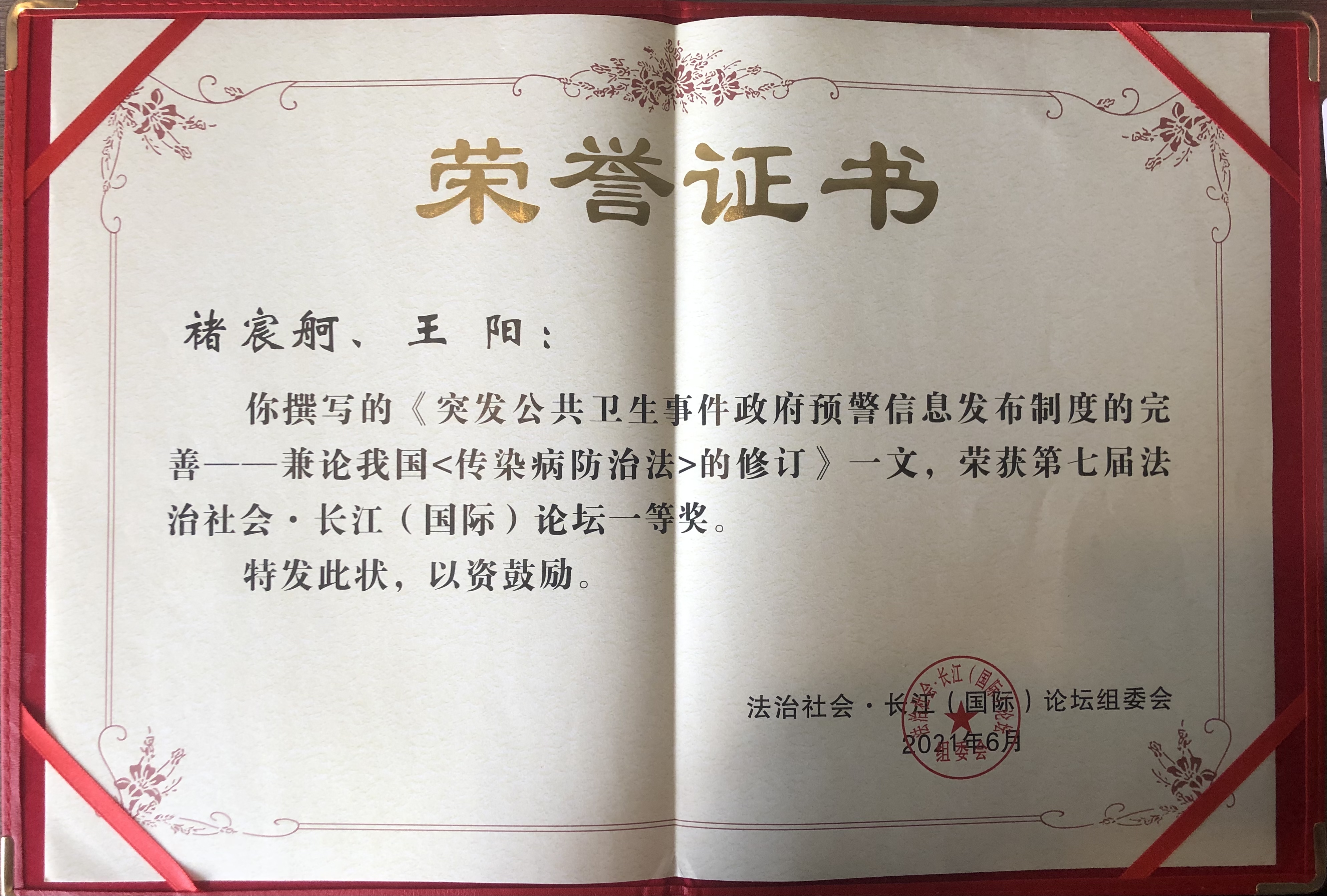 褚宸舸、王阳合作撰写的会议论文《突发公共卫生事件政府预警信息发布制度的完善》经过评审获得一等奖,徐汉明教授在会议总结中,对该论文观点进行了介绍。王阳博士生受褚宸舸教授委托,在闭幕式上接受获奖证书,并在会后赴湖北卫健委法规处调研地方卫生法律治理工作。