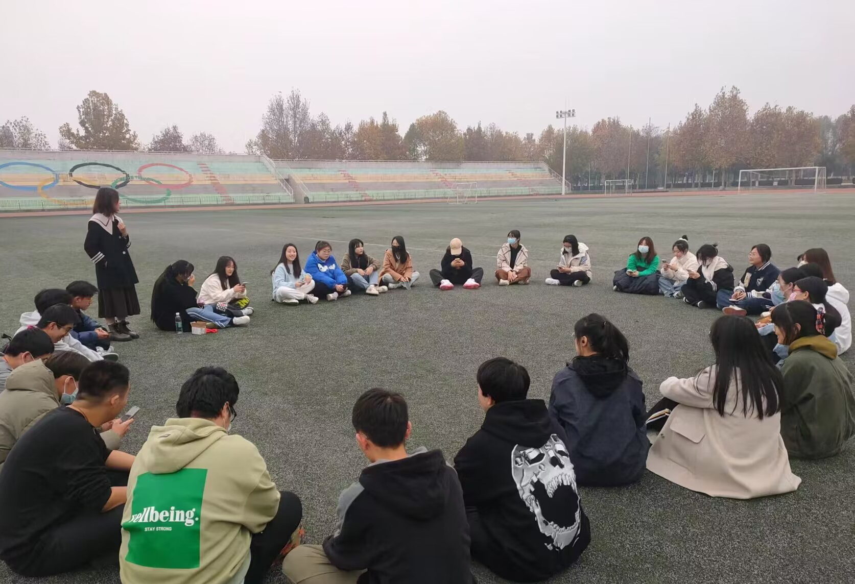 2022级5班的同学们围坐在绿色草坪上,逐一进行自我介绍。随后进行了“不要做挑战”游戏,在欢快愉悦的氛围中增进彼此的了解。