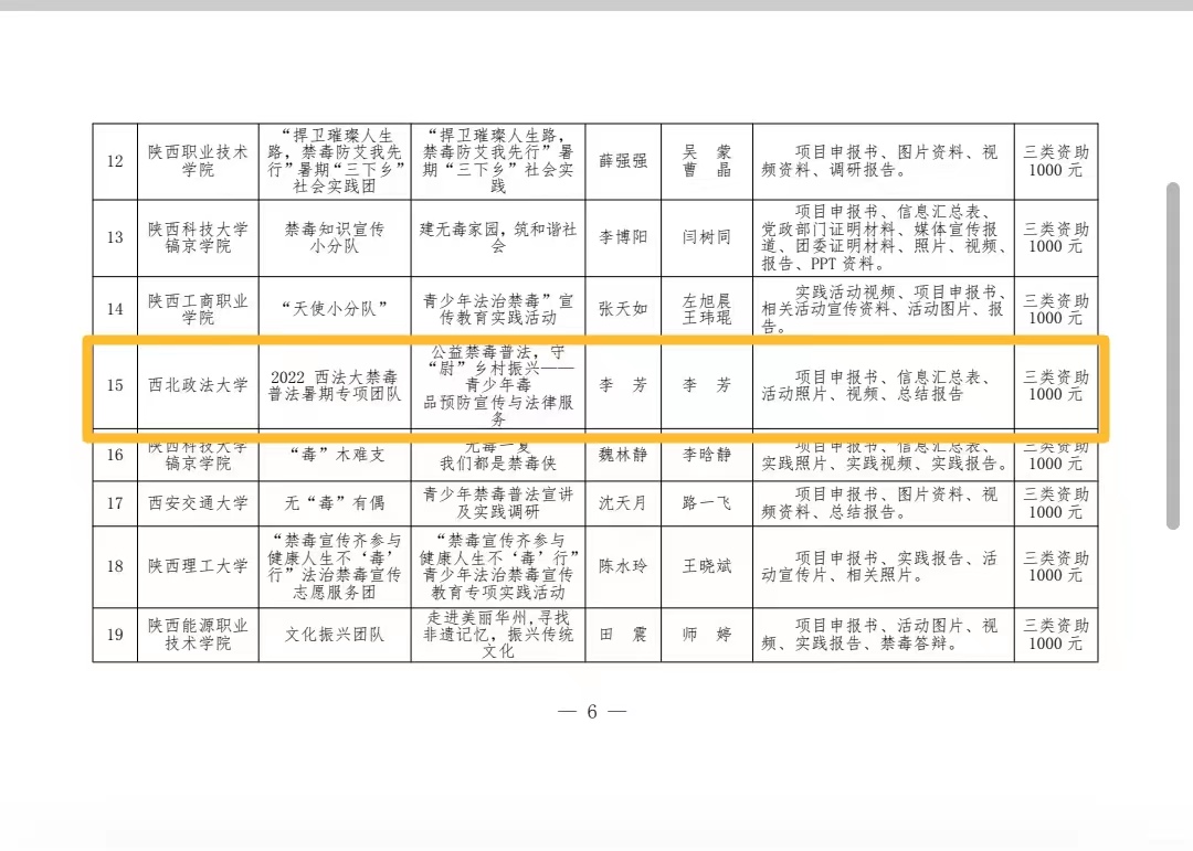 该团队经由学校团委推荐,参加共青团陕西省委2022 年度“争做禁毒先锋 守‘尉’无毒家园”青少年法治禁毒宣传教育专项实践活动的项目申报,实践开展、活动梳理总结,以及项目评审、复审,最终获得资助团队。