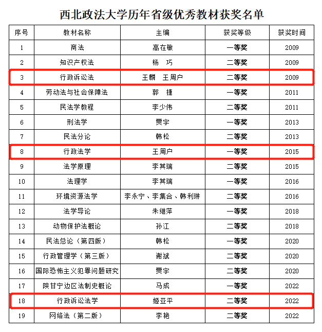 高度重视教材建设工作,始终把人才培养作为根本任务,不断改革进取,提高教学质量,在专业、课程、教材、教学改革等方面持续发力,积极推动教师编写和建设质量好、水平高、有特色、有影响力的精品教材,在教材建设方面取得了优异成绩。现累计获批省级优秀教材3部,分别是《行政诉讼法》(王麟、王周户主编,法律出版社2005年版)、《行政法学》(王周户主编,中国政法大学出版社2015年版)以及《行政诉讼法学》(姬亚平主编,中国政法大学出版社2016年版)。