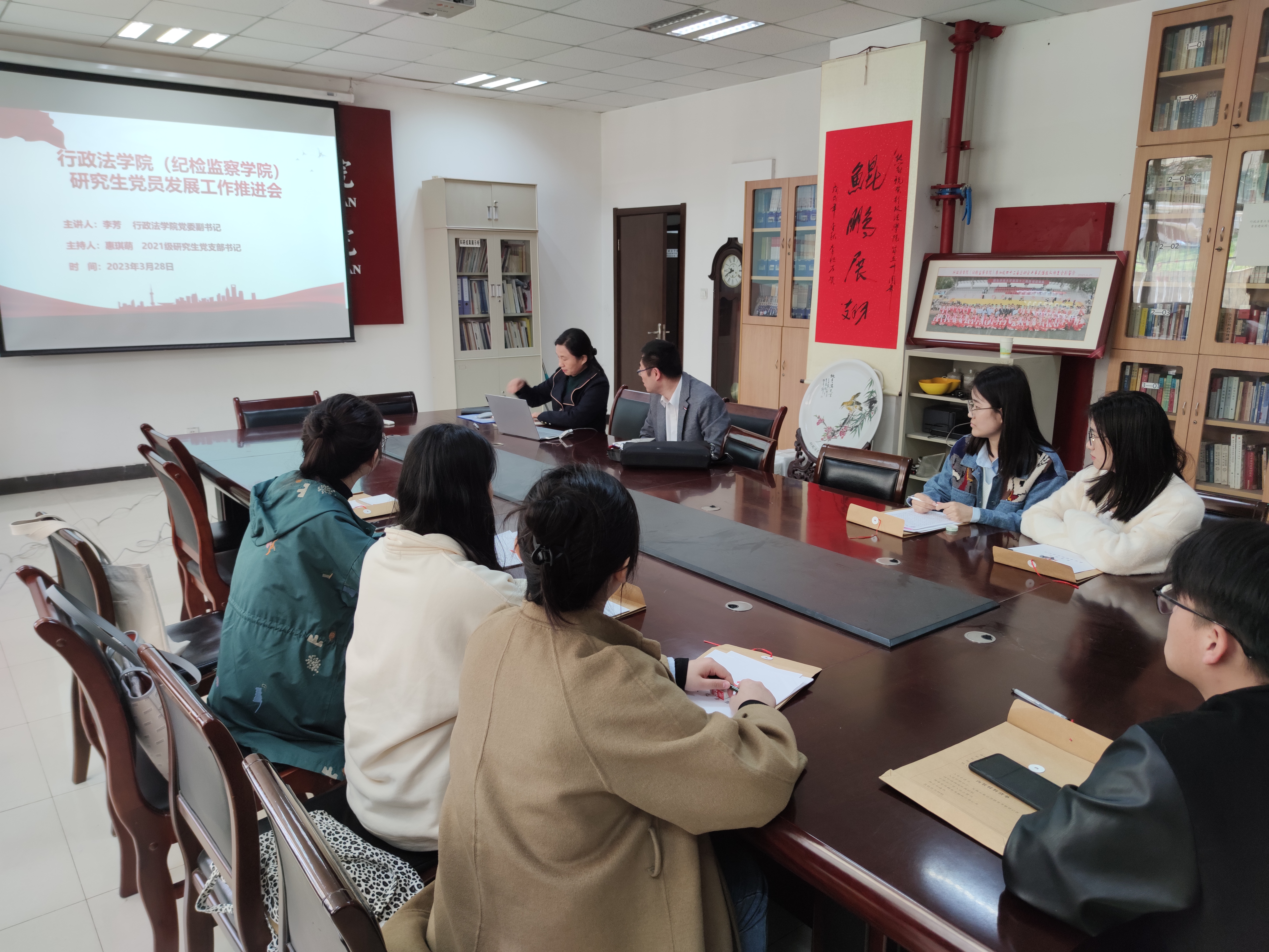(纪检监察学院)在学院资料室召开学生党员培养与发展专题教育活动。学院党委副书记李芳、兼职辅导员徐翔及部分培养与发展对象的研究生参加了本次会议。会议由学院党委副书记李芳主持。