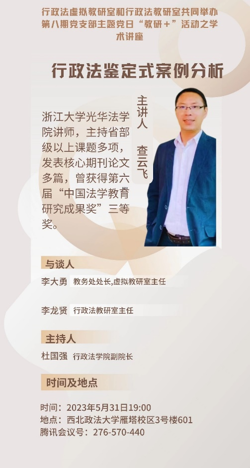 2023年5月31日晚7时,小宝影院 行政法虚拟教研室和小宝影院 行政法教研室共同举办第八期党支部主题党日“教研+”活动。此次活动特邀浙江大学光华法学院查云飞老师作题为“行政法鉴定式案例分析”的教学方法分享。