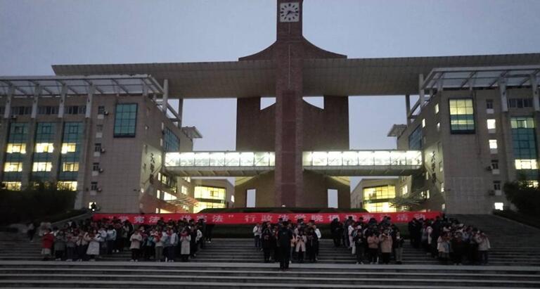 举办了宪法诵读活动,各班级学生利用晨读时间以集中形式诵读宪法文本。伴随着清晨的几缕阳光,学生们在庄严高大的天平楼下手持宪法文本,用慷慨有力的声音朗读宪法,传达自己对宪法的尊崇,整个过程庄重而肃穆。集体诵读宪法活动切实的营造了尊崇宪法的仪式感,通过集体诵读这种形式,不仅让宪法“声”入人心,而且也让学生感受到了宪法的尊严,极大地增强了学生的宪法体验。