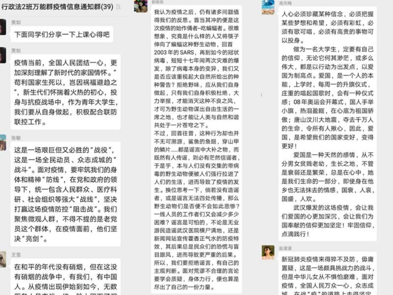 观看过程中同学们认真写下笔记,记录所想所感,结束后将自己的想法分享至微信群内进行讨论,大家一致表示磨难压不倒中国,疫情更能使中国团结奋起。
