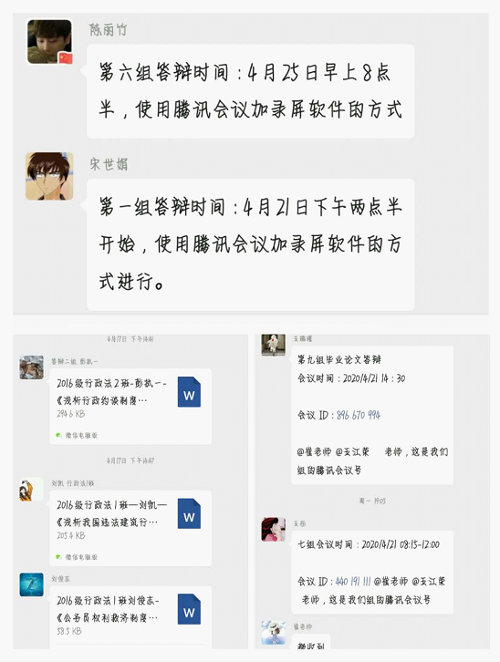 2020年4月20-25日,小宝影院 2020届本科毕业论文行政法方向答辩工作顺利结束。参加本次行政法方向毕业论文答辩的共有174名同学,共分为10组。本次答辩以“腾讯会议+实时录屏”的方式开展,为了确保此次线上答辩工作的顺利开展,每组由三名导师、一名答辩秘书共同负责。此外,校督导组专家张宏斌老师、学院督导组老师也对此次答辩工作进行了指导。