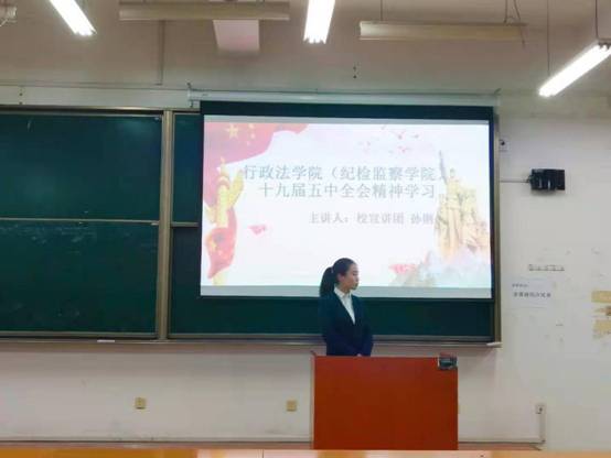 主讲人孙俐为作为法科学生提出宝贵建议:首先需要不断提高理论素养,其次需要不断加强专业学习,最后需要培养将理论转化为实践的本领并用正确的法治理论引领法治实践,从而为法治国家建设贡献出自己的力量。台下同学们聚精会神,于本次活动中认真学习十九届五中全会精神,许下为法治中国建设助力的心愿。
