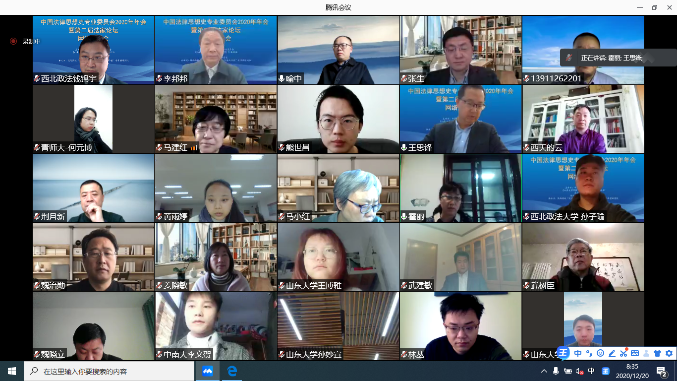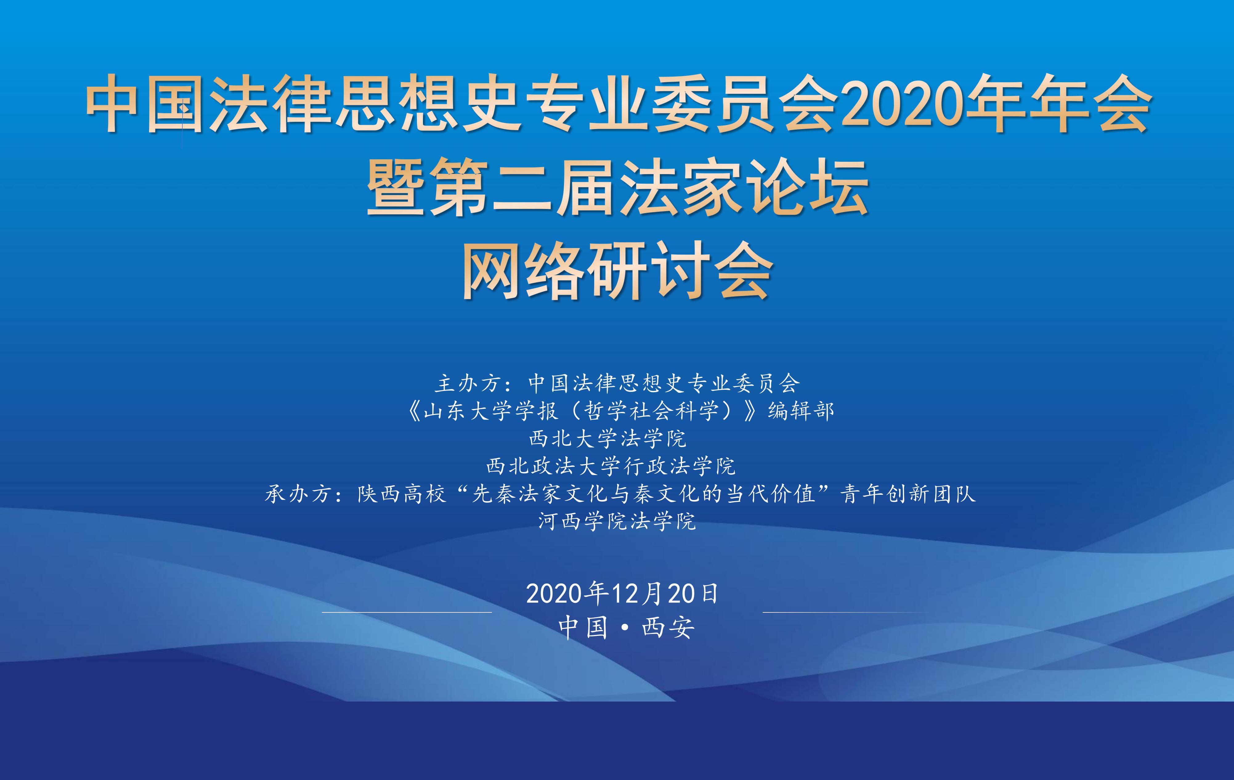 12月20日,由中国法律思想史专业委员会、《山东大学学报(哲学社会科学)》编辑部、西北大学法学院、小宝影院 主办,陕西高校“先秦法家思想与秦文化的当代价值”青年创新团队与河西学院法学院承办的中国法律思想史专业委员会2020年年会暨第二届法家论坛网络研讨会召开。来自中国社会科学院法学研究所、清华大学、中国人民大学、山东大学、中国政法大学、北京师范大学、中南财经政法大学、青岛科技大学、沈阳师范大学、山东师范大学、杭州师范大学、青海师范大学、中共广东省委党校、西北工业大学、西北农林科技大学、商务印书馆、西北大学、小宝影院 、河西学院等高校和出版机构90余位专家学者出席本次会议,围绕先秦法家文本与思想、法家流派、先秦法家思想的当代价值等议题进行了深入探讨。与会学者一直认为,要在习近平法治思想的指导下,推进中国法律史研究的守正创新,为中国国家治理现代化和法治中国建设做出积极贡献。