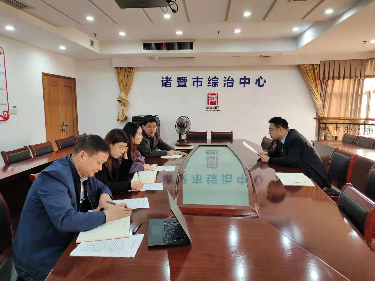 褚宸舸教授在诸暨市政法委就学生实训事宜与政法委枫桥经验发展研究中心主任郭松浩和副主任丁利培进行座谈。会议上,褚宸舸教授在了解三位学生的实训内容、工作状态以及食宿条件后,对政法委的实训培养模式进行了肯定,并对政法委的周密安排、高度重视表示感谢。郭松浩主任表示,政法委作为一个实务部门,在理论研究方面有待加强,希望三位实习研究生在深入了解枫桥经验的基础上结合实践进行理论总结。褚宸舸教授嘱咐学生要服从政法委管理,注意工作纪律和安全,积极参与实践,深入学习枫桥经验。