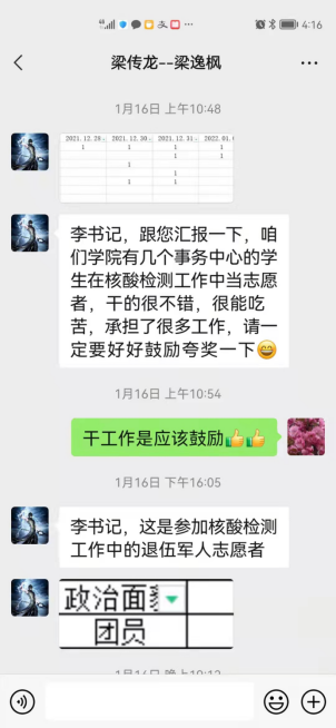 退伍军人张自翔以及钟珺文、薛开胜、杨倩、王奕菲、黄梦瑶、王玉茜、王苗、史晓雅等学生,积极参与到学校的疫情防控之中,协助学校的核酸检测,网络宣传等工作,在工作过程中学生们吃苦耐劳、积极肯干,受到了学生处的肯定和表扬。